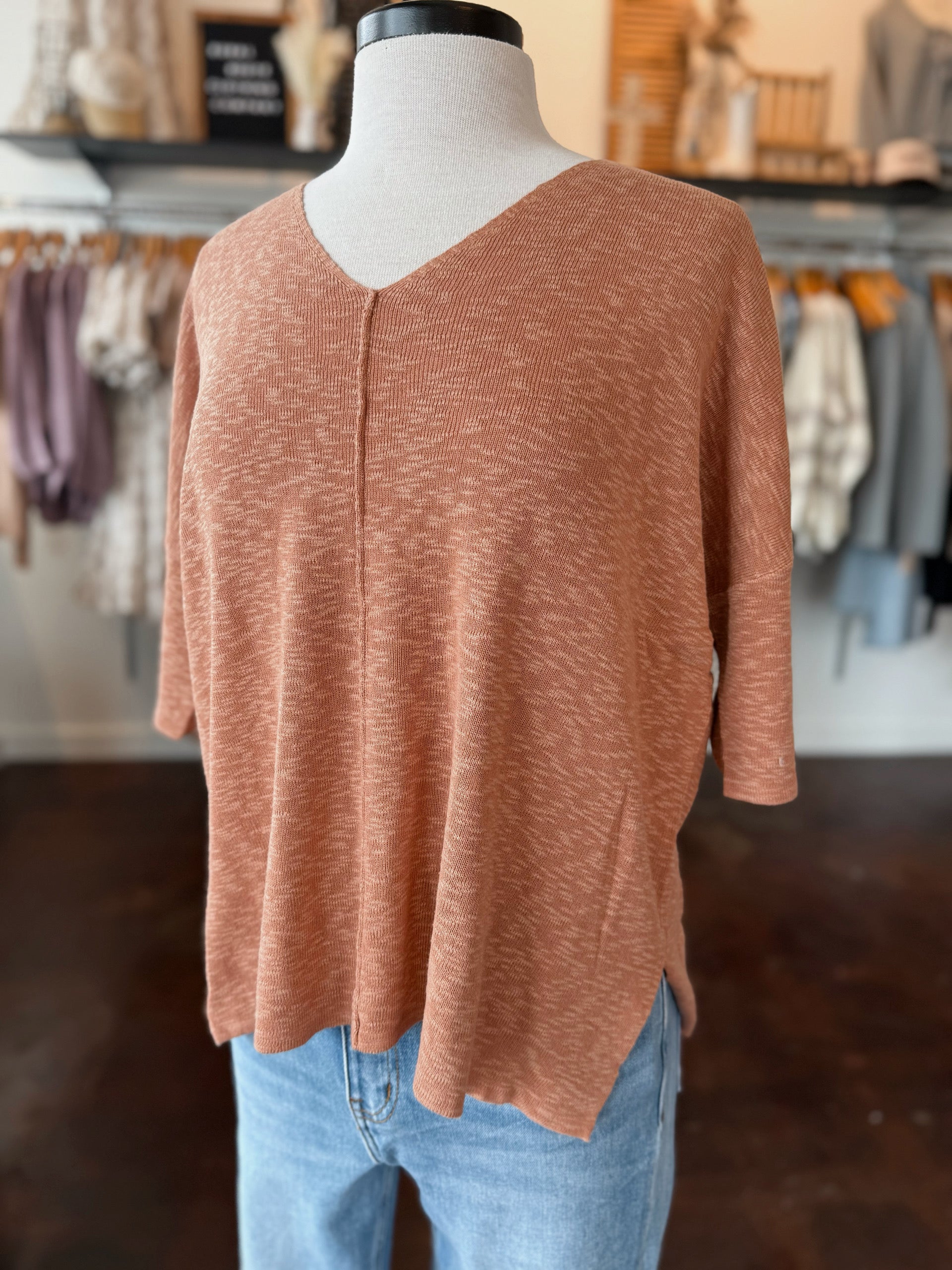 Experience effortless style with the Anything But Basic Top in Terracotta. This lightweight, breathable cotton slub sweater features a relaxed oversized fit with a flattering V-neck and drop shoulders for ultimate comfort. The raised center seam and side slits add subtle detail, making it perfect for layering or wearing on its own. Embrace casual elegance with a top designed to keep you comfortable and stylish all day long.