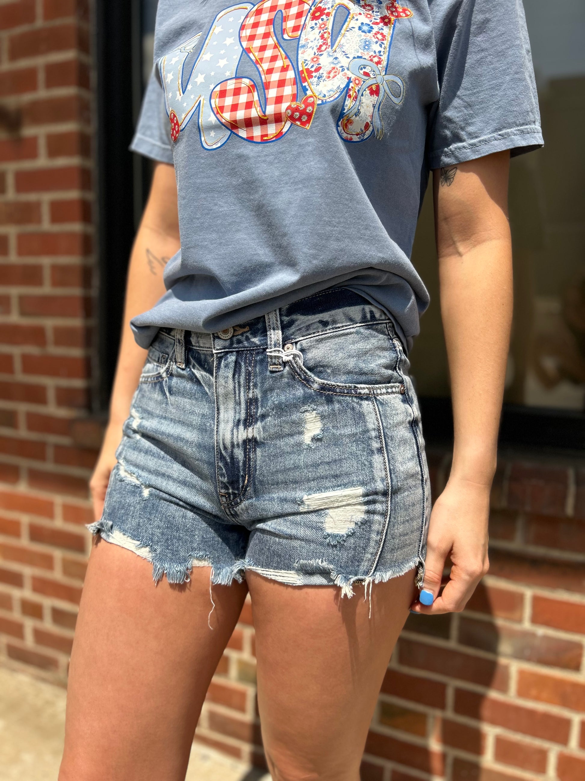 These high-rise distressed denim shorts offer a flattering fit with a medium wash and rigid fabric for lasting shape. Featuring a zip fly and frayed hem, they combine classic style with a modern edge. Perfect for everyday wear, they provide comfort and confidence in a versatile design.