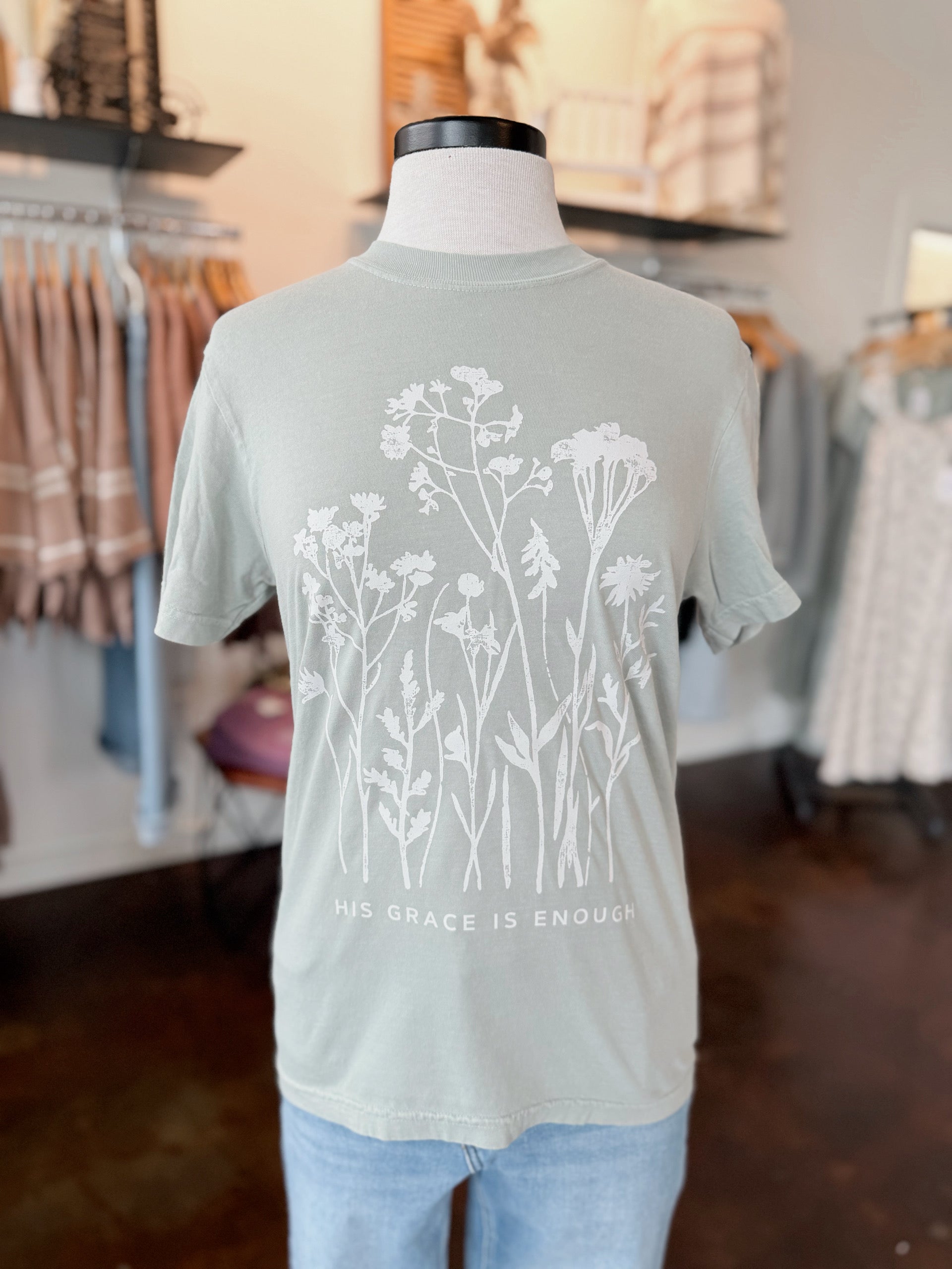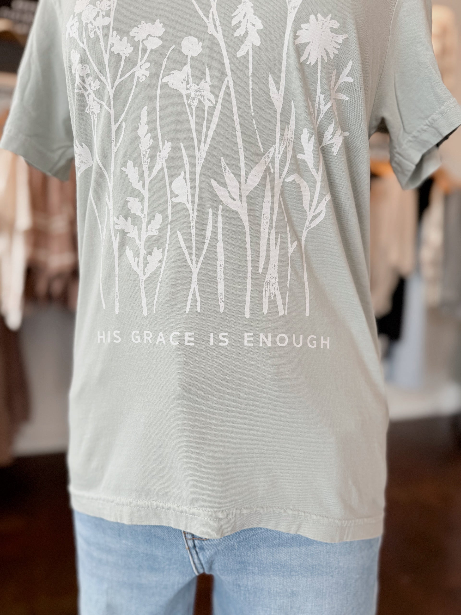 Experience effortless comfort and meaningful style with the His Grace Is Enough Tee in soothing Bay color. Crafted from cozy Comfort Colors fabric, this tee ensures a soft, lived-in feel all day long. Featuring a delicate wildflowers design, it adds a touch of natural beauty that complements your faith and personality. Perfect for casual wear or as a thoughtful gift, this tee blends comfort and inspiration seamlessly. Embrace grace in every moment with a shirt designed to keep you comfortable and confident.
