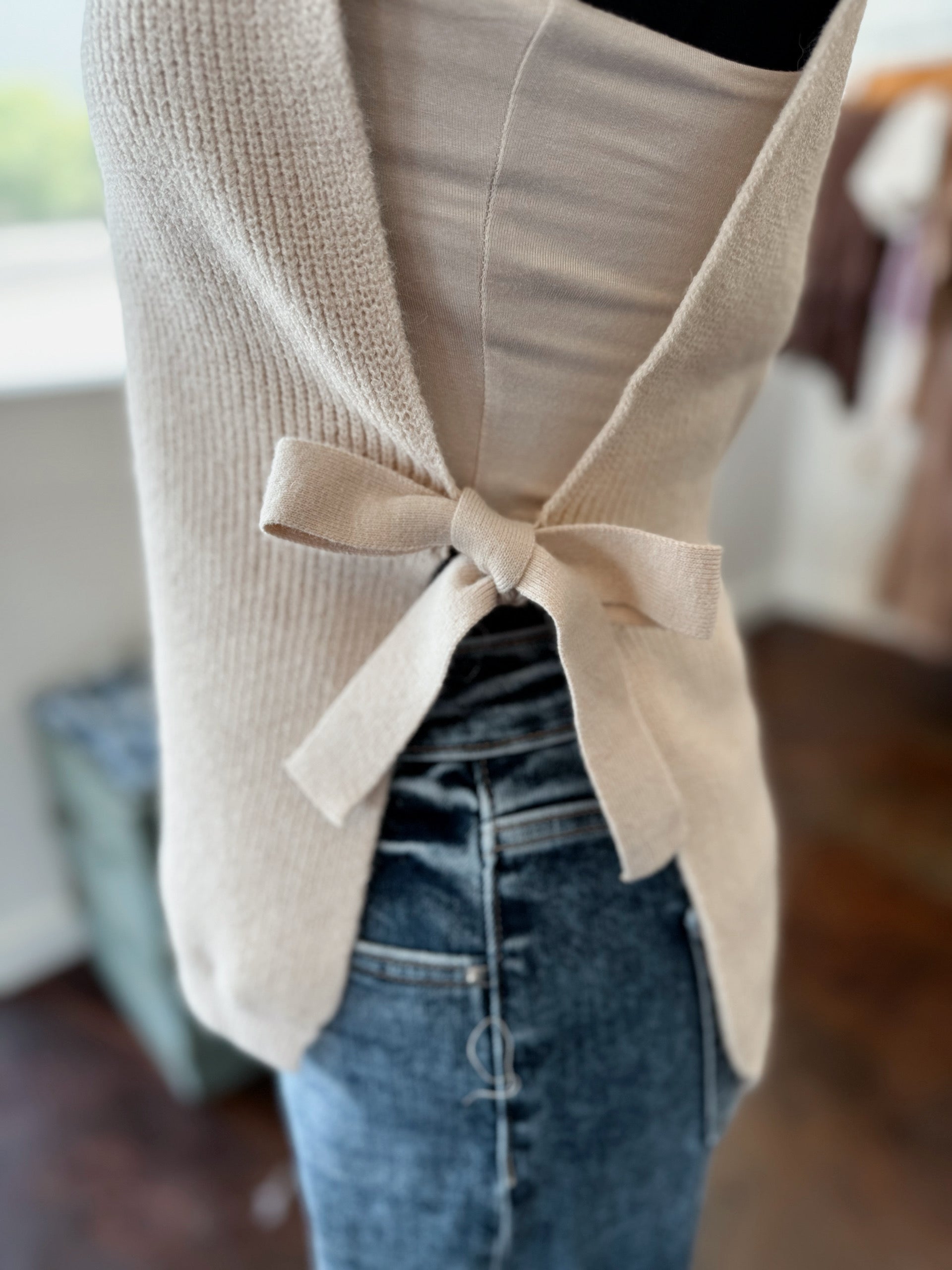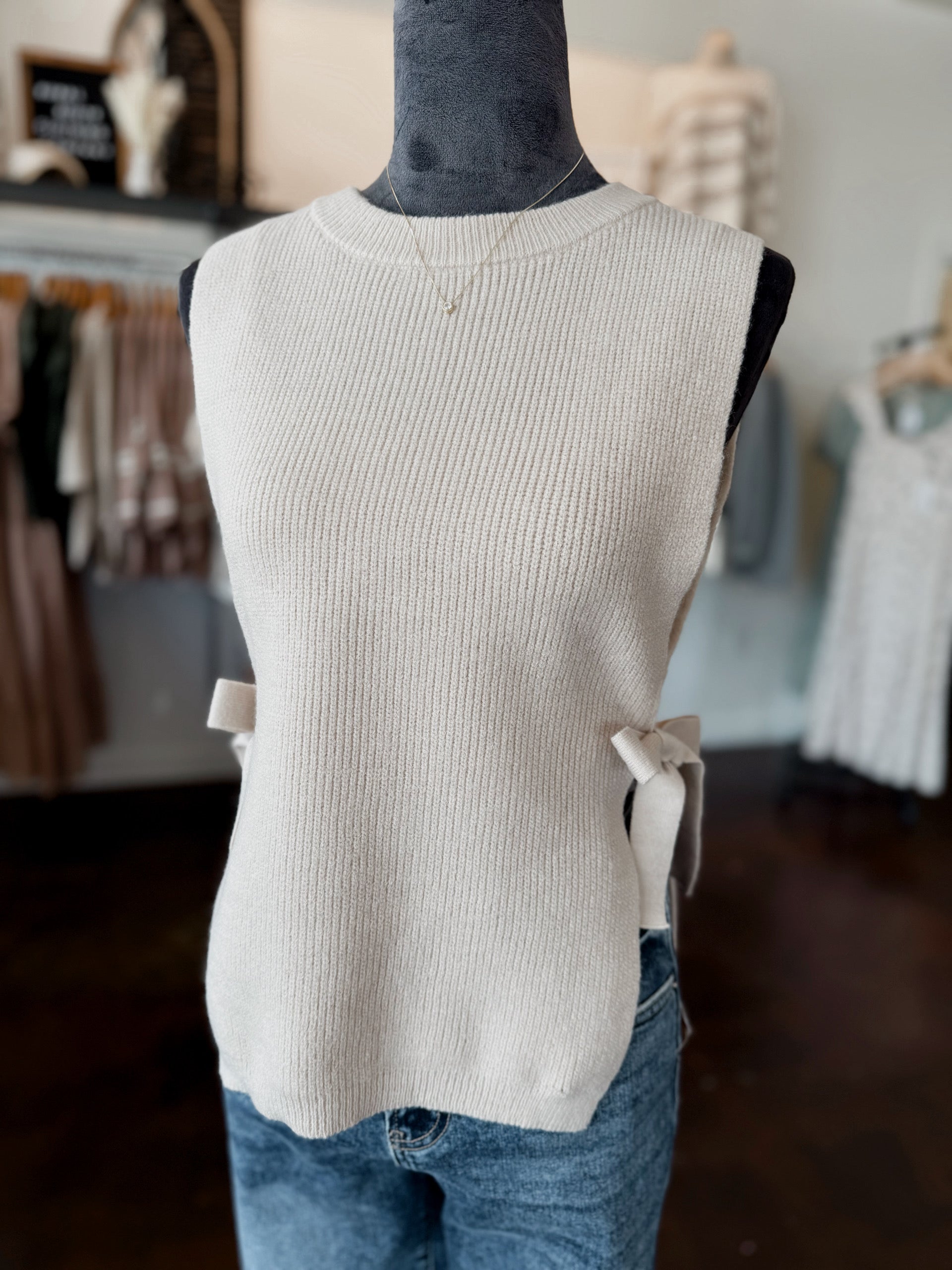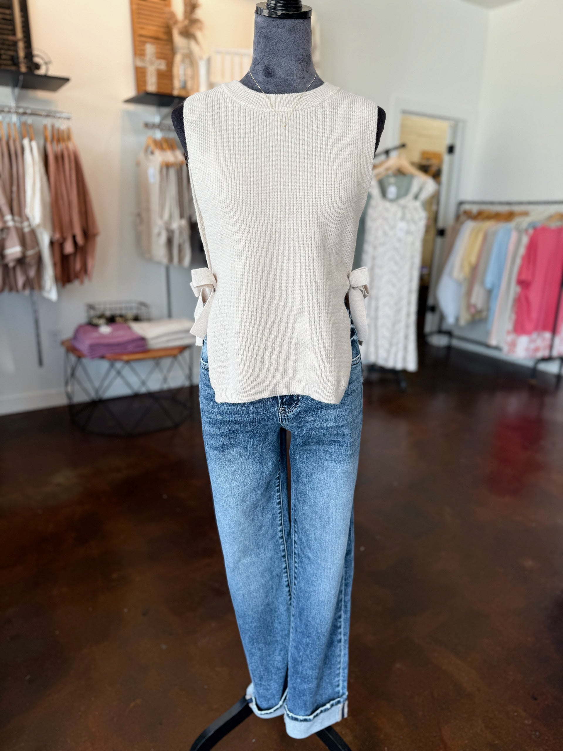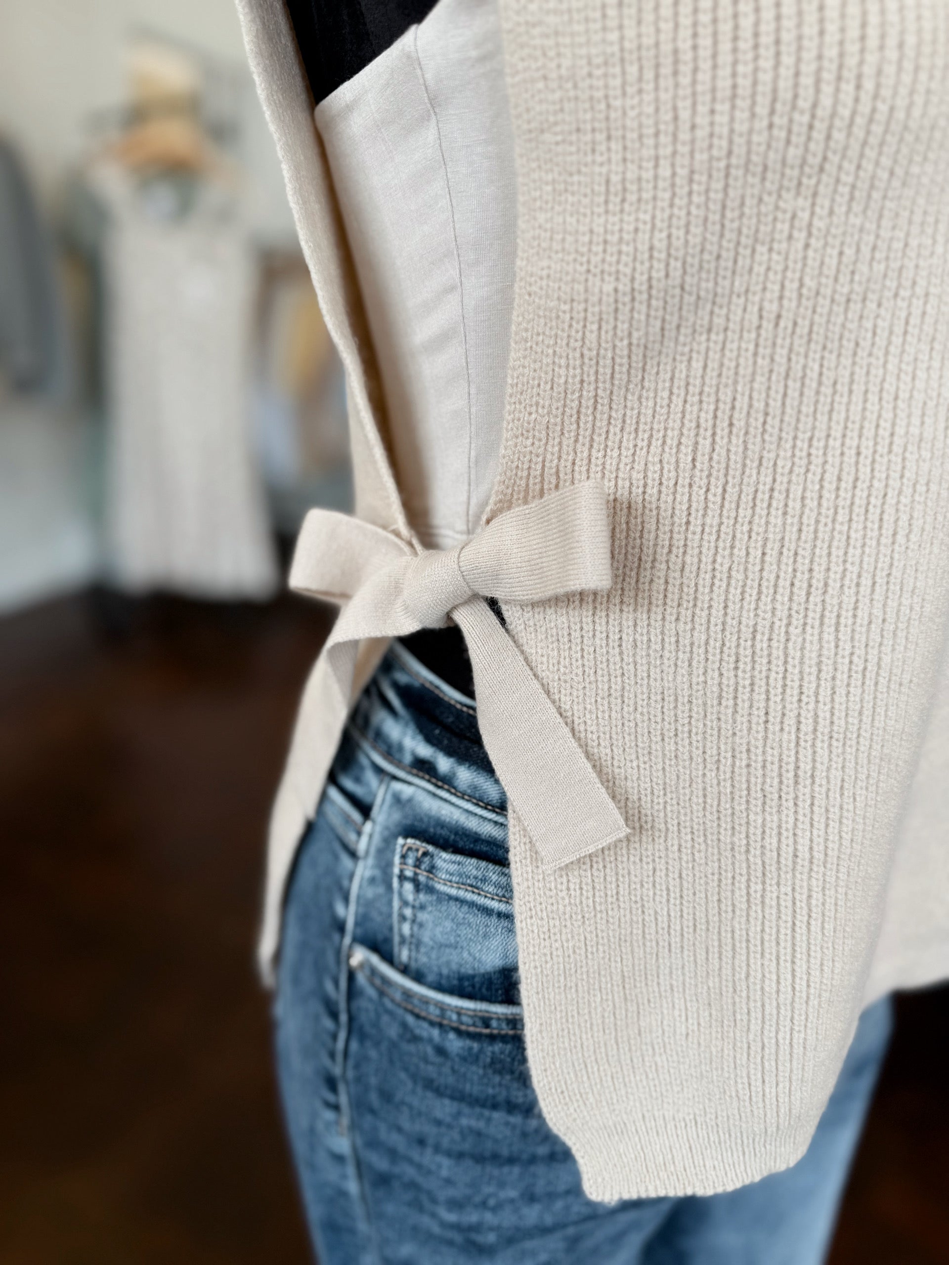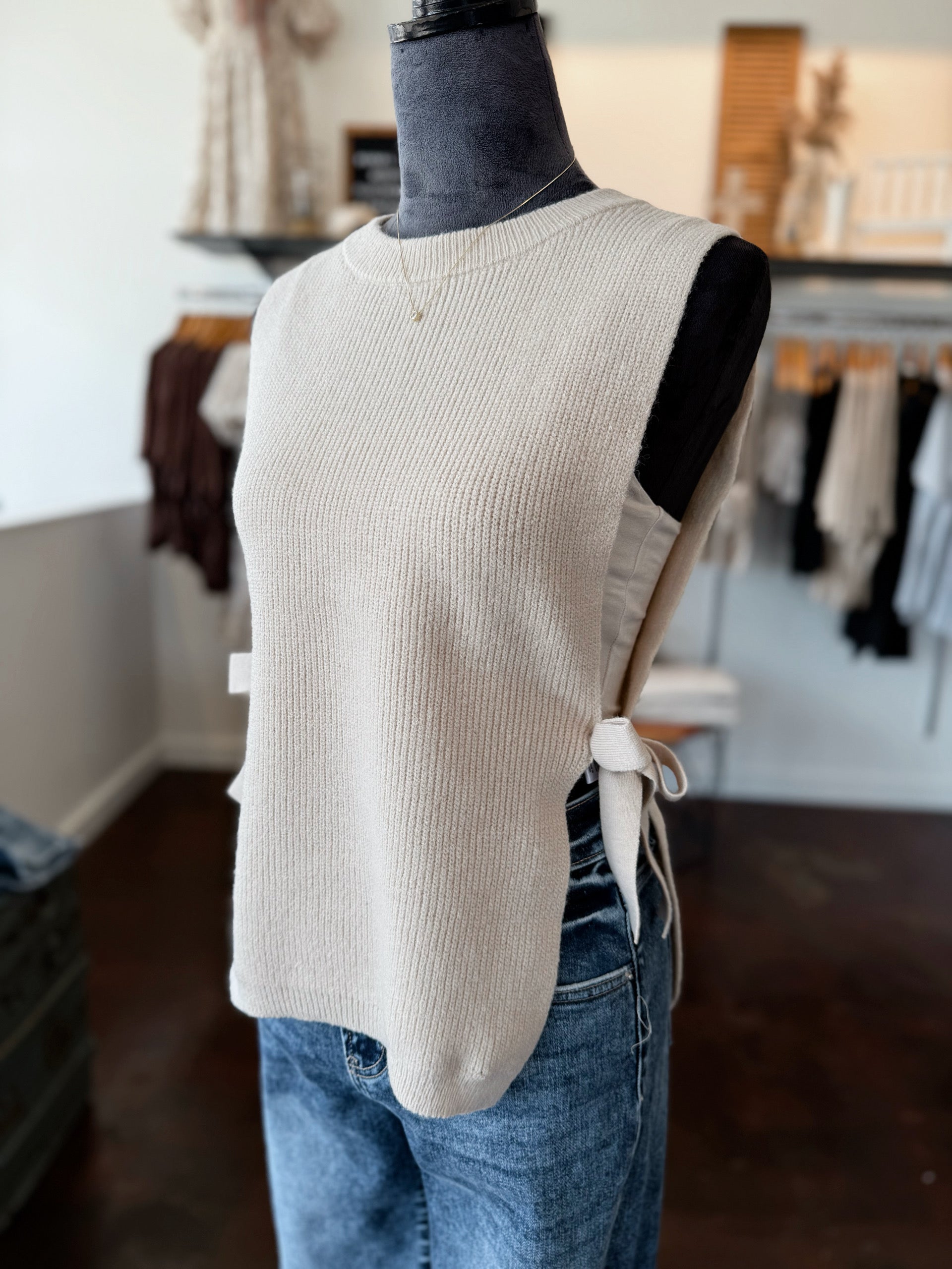 Elevate your weekend wardrobe with the Side Tie Sweater in Sand. Its vest style and side tie detail offer a chic, effortless look ideal for cozy afternoons at the pumpkin patch or stylish dinners with friends. Pair it with our Double Layer Cami in Sand for added comfort and a flawless layered finish. This versatile piece blends relaxed charm with polished style to keep you looking and feeling your best.