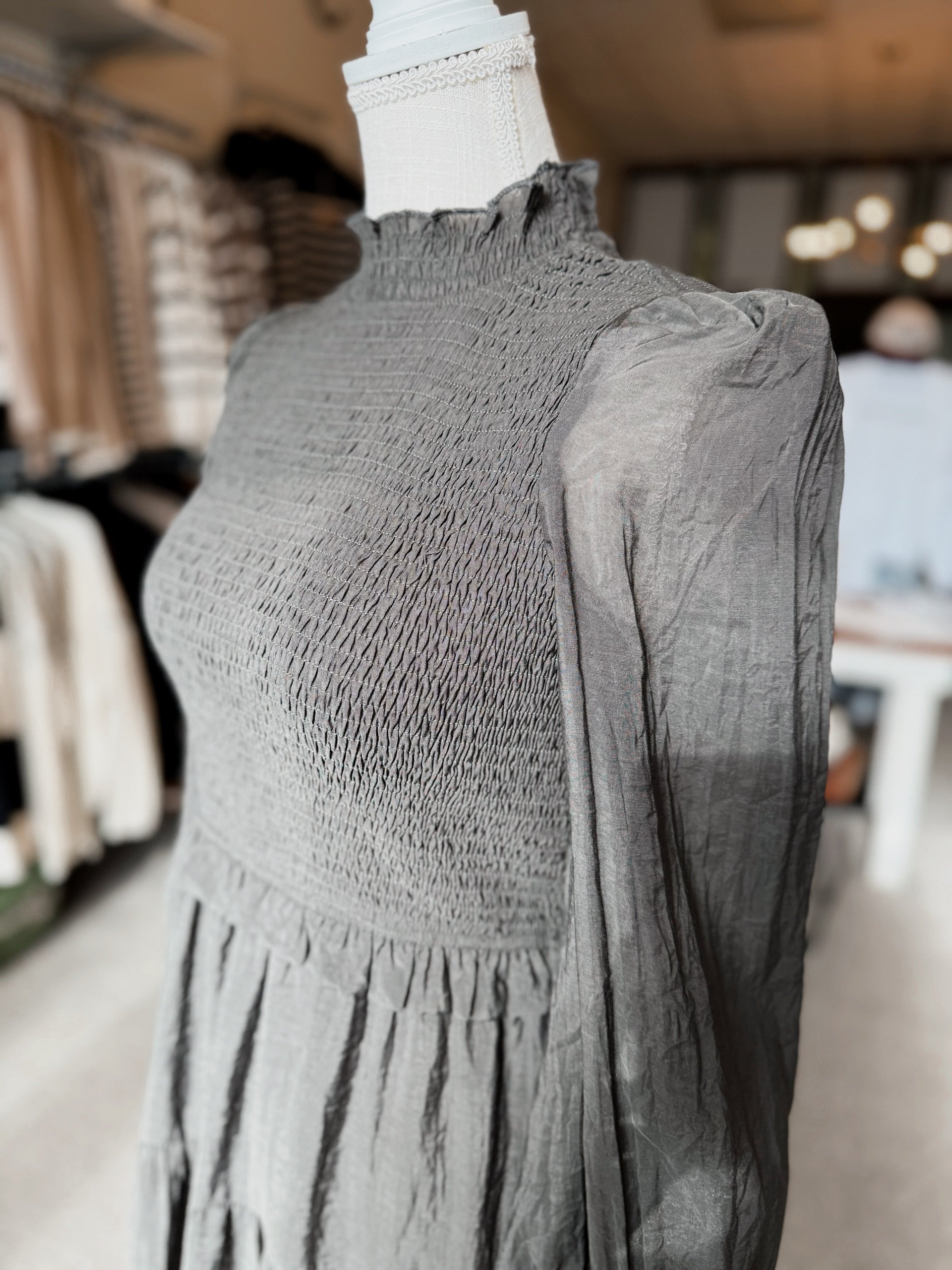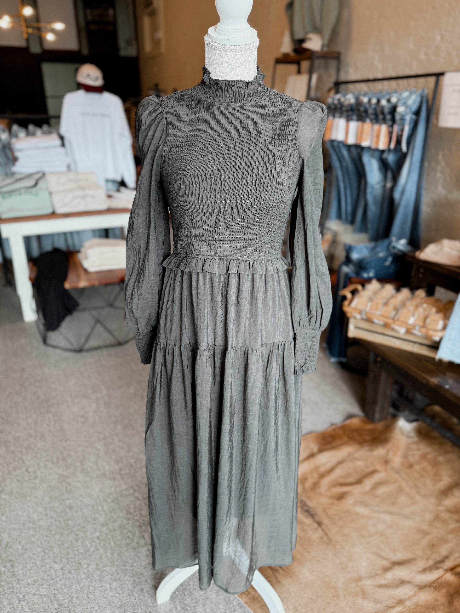 Smocked Bodice Ruffle Maxi Dress - Charcoal