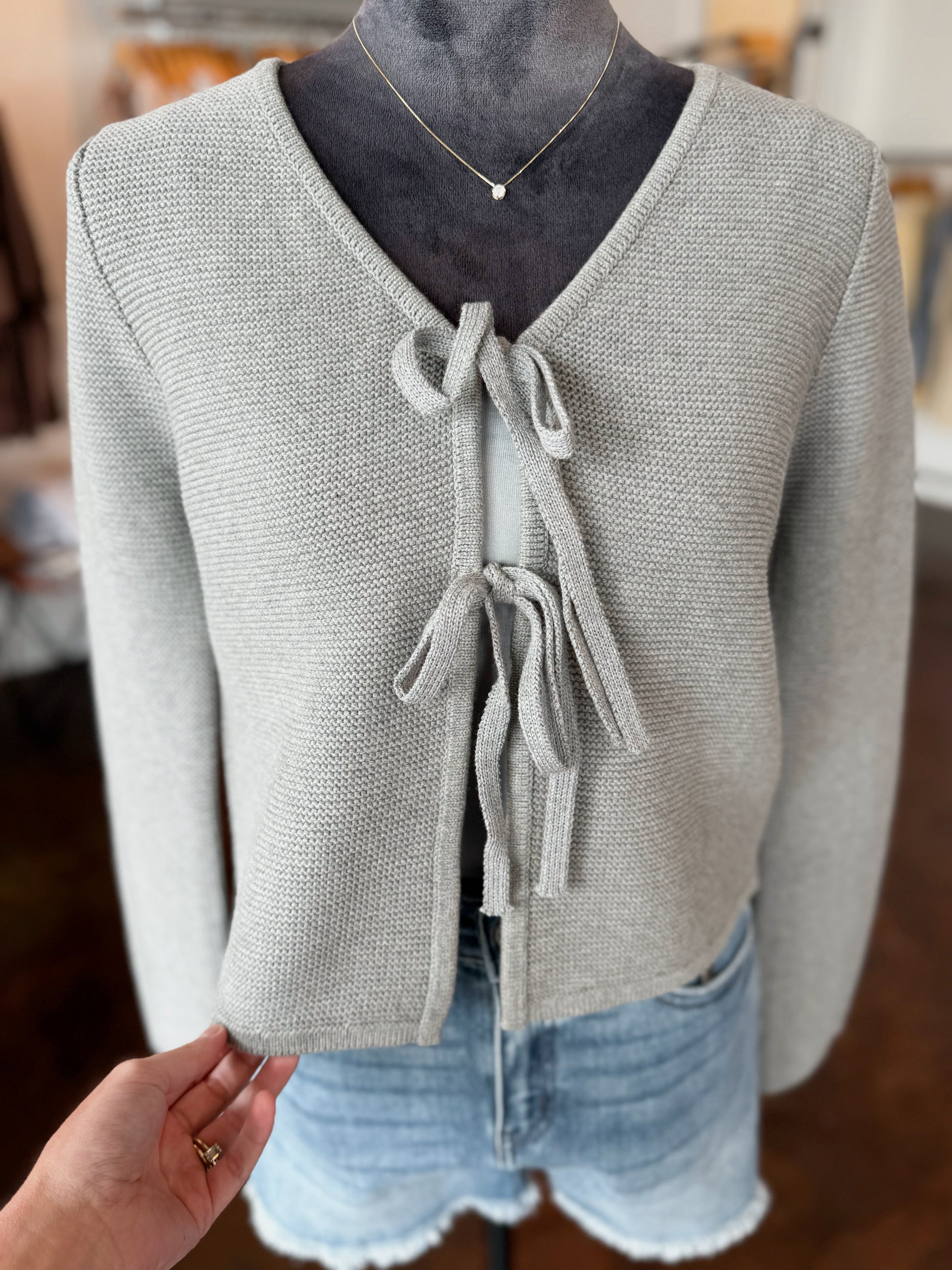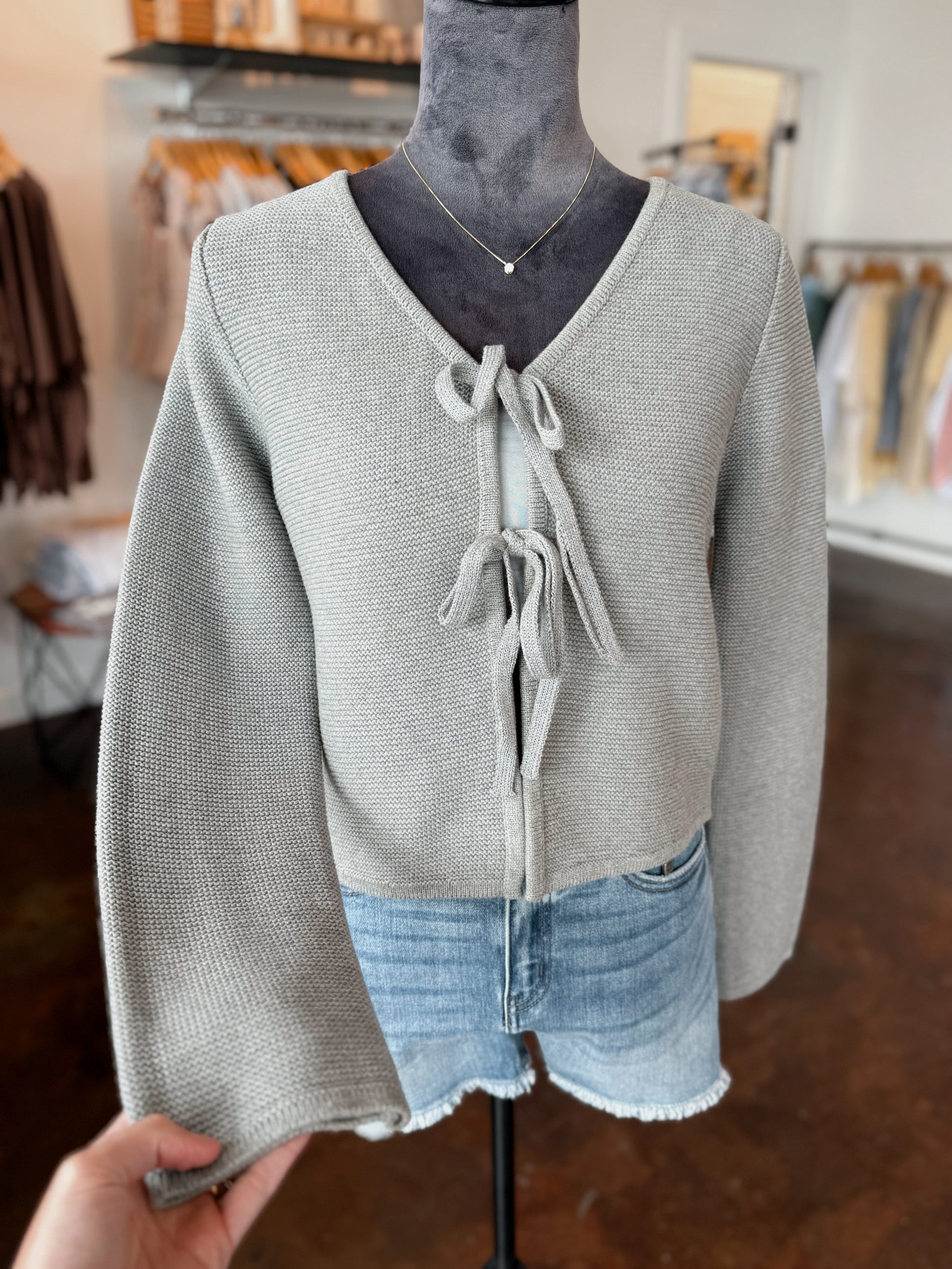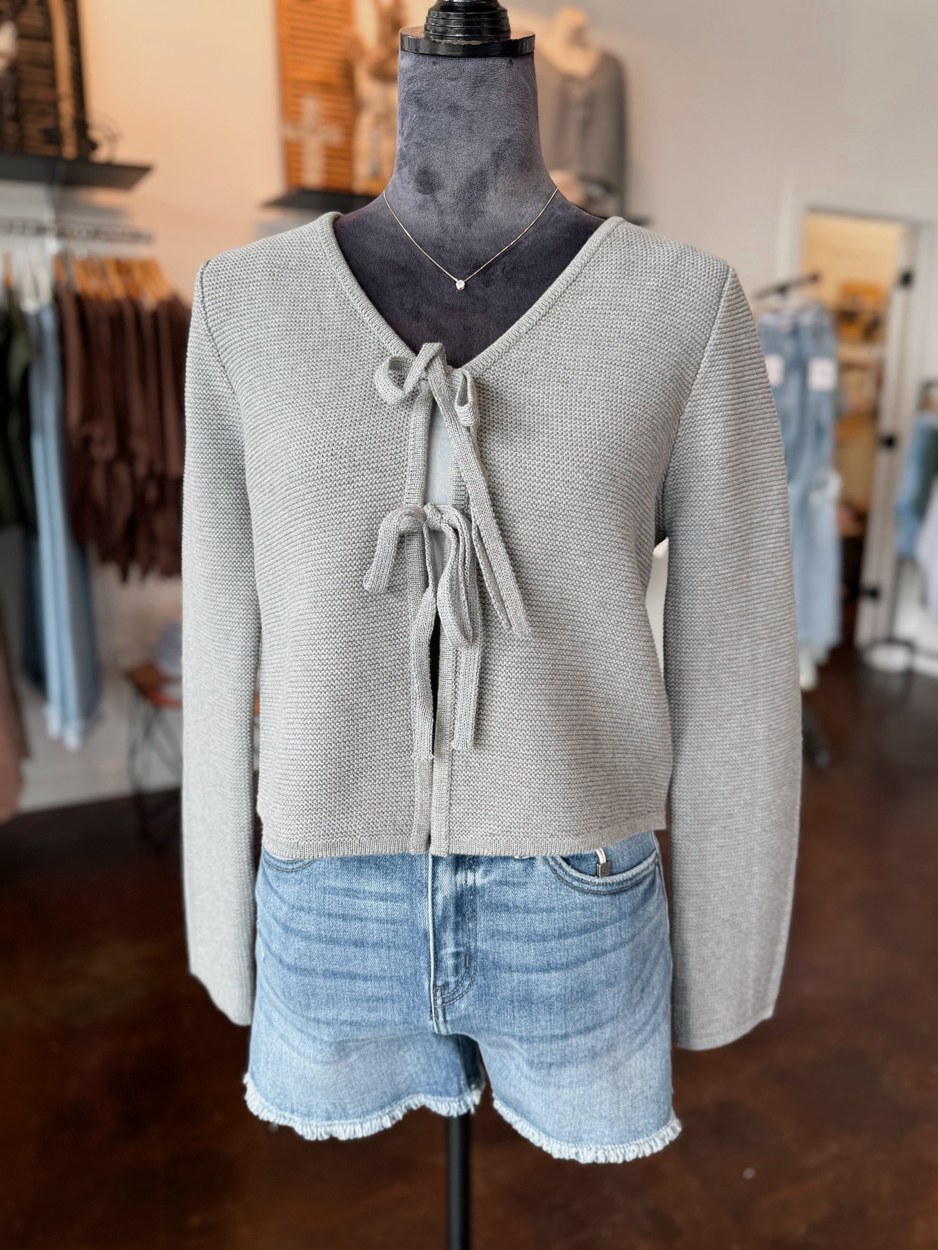 Elevate your wardrobe with the Tie Front Sweater in heather grey, featuring charming tie bows that add a feminine touch. This cozy cardigan pairs effortlessly with our double layer cami in light grey, creating a stylish and comfortable layered look perfect for any occasion.